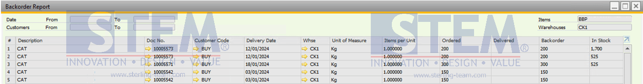 Setelah menentukan kriteria yang diinginkan, pengguna dapat menekan tombol ‘OK’, dan sistem akan menampilkan Backorder Report dalam bentuk tabel seperti berikut: