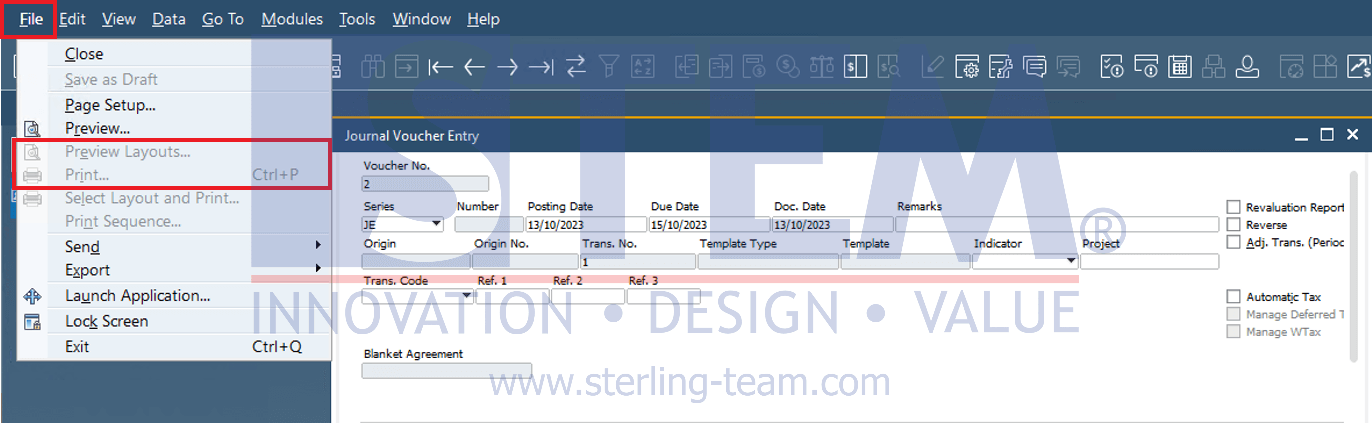Hal ini memang merupakan standar sistem di SAP Business One. Journal Voucher Entry hanya digunakan untuk melakukan input atau pencatatan transaksi. Dari jendela ini, pengguna tidak bisa langsung mencetak dokumen.