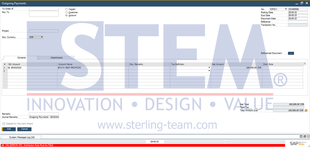 Setelah pengaturan selesai, apabila pengguna membuat transaksi seperti Marketing Document, Journal Entry, atau Outgoing Payment dan menggunakan akun yang diwajibkan untuk mengisi Distribution Rule, tetapi belum mengisinya, maka sistem akan menampilkan pesan error dan tidak mengizinkan transaksi dilanjutkan seperti berikut: