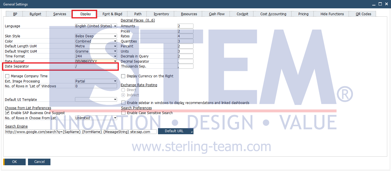 Dalam SAP Business One, pengguna memiliki fleksibilitas untuk mengubah tanda pemisah tanggal (Date Separator) sesuai kebutuhan. Pengaturan ini berguna karena tidak hanya memengaruhi tampilan tanggal pada dokumen atau form di SAP B1, tetapi juga berdampak pada data yang dihasilkan dari query dan report. Menu untuk mengubah karakter pemisah pada format tanggal dapat diakses melalui: