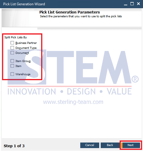 Jika pick list tidak perlu dipisahkan, maka tidak perlu memilih parameter yang ada dan langsung klik “Next”.