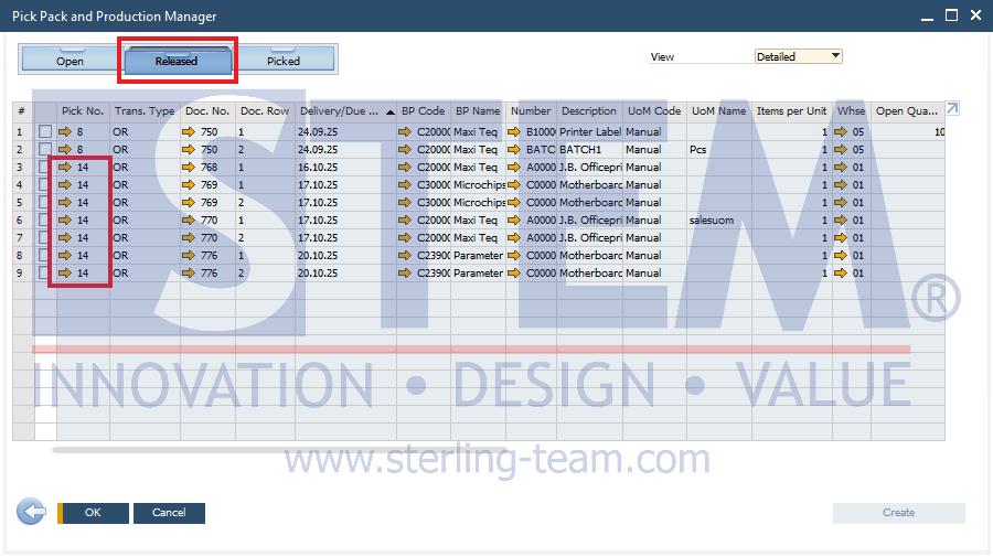 - Pick List yang berhasil dibuat dapat dilihat pada Pick Pack and Production Manager, tepatnya pada tab Released. Klik pada panah emas di kolom Pick No.
