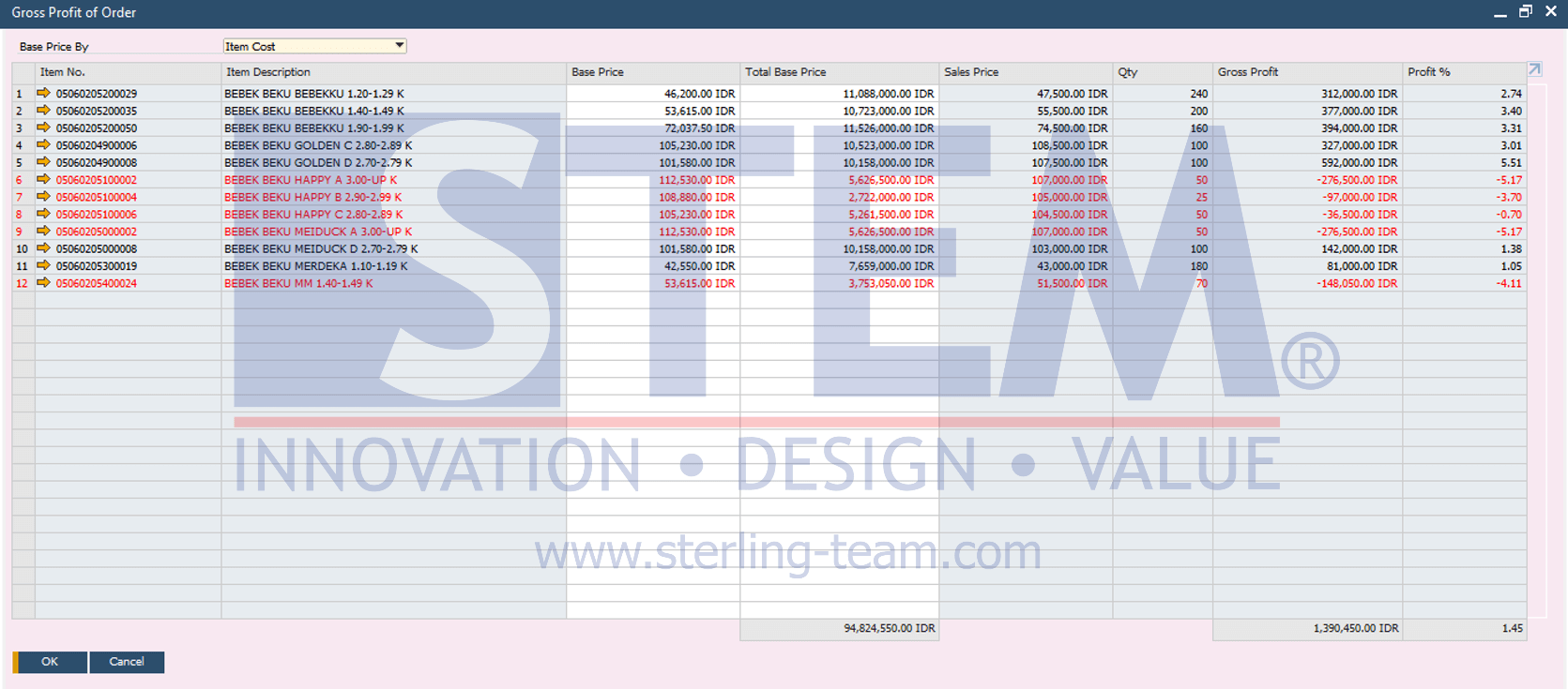 - Gross Profit: Nilai laba kotor yang diperoleh dari perhitungan (Sales Price x Quantity) – (Base Price x Quantity). Apabila nilai laba kotor menghasilkan nilai negatif maka akan tertera pada halaman Gross Profit of Order dengan warna merah di setiap barisnya.