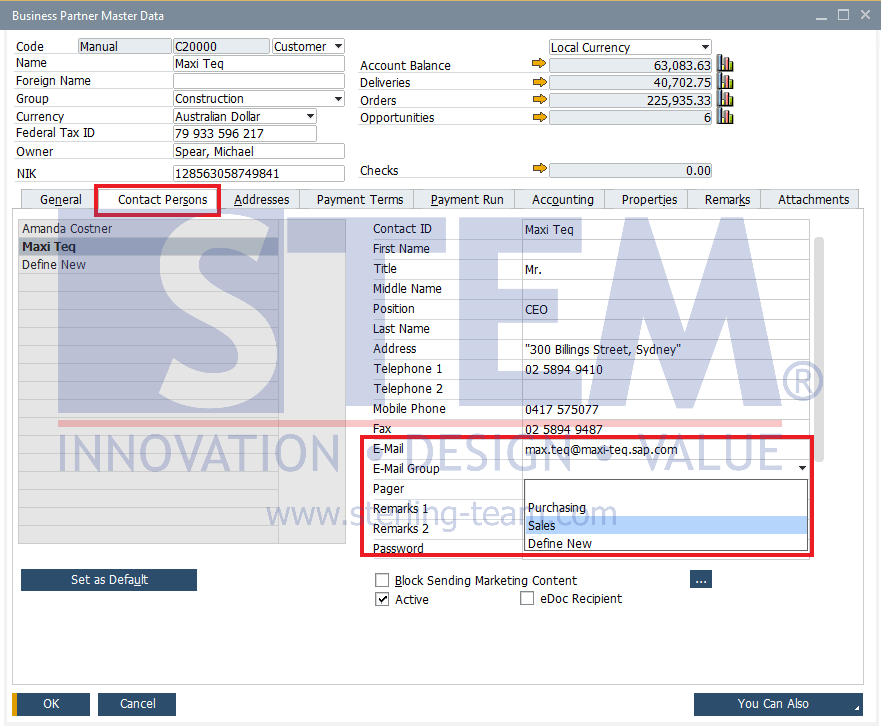 - Menugaskan Email Group pada kontak di Business Partner Master Data.