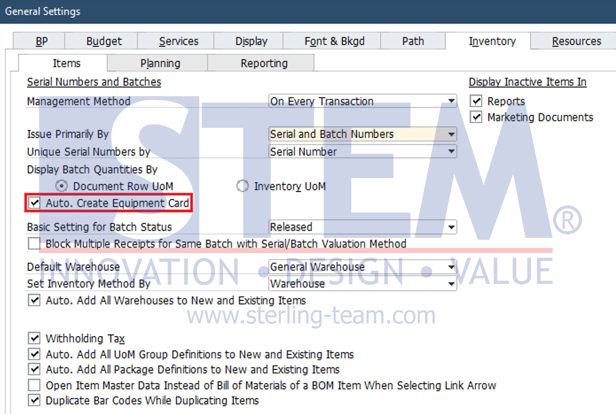 - Pada tab Inventory, centang opsi “Auto. Create Equipment Card”.