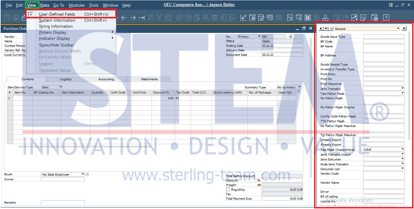 User Defined Field (UDF) biasanya digunakan ketika membutuhkan Field tambahan dalam suatu dokumen. Pengguna dapat melihat UDF apa saja yang ditambahkan dengan menampilkan jendela UDF di sebelah kanan tampilan transaksi. Berikut cara untuk menampilkan ataupun menyembunyikan jendela UDF: