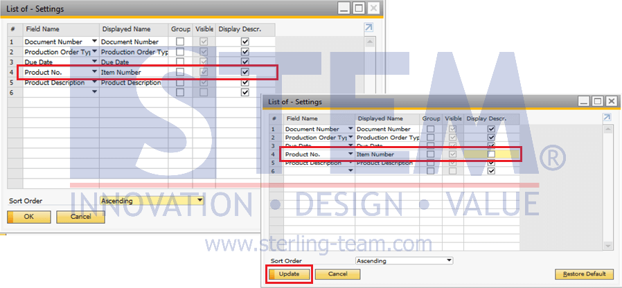 - Pada jendela List of – Settings, hapus centang pada kolom Display Descr. di baris Product No. (Item Number).