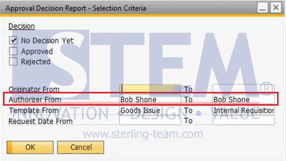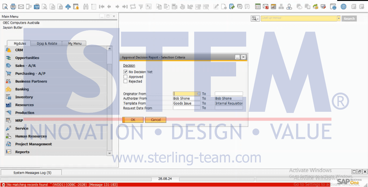 Isi field selection criteria saat membuka menu Approval Decision Report pada SAP Business One akan selalu mengikuti input terakhir yang diisikan. Namun, jika mengubah user name di menu User dari user yang ditugaskan (assigned user) menjadi Originator/Authorizer dalam jendela Approval Decision Report – Selection Criteria, maka akan muncul notifikasi error “No Matching Records Found” saat membuka Approval Decision Report. Berikut adalah skenario yang dapat menyebabkan error tersebut: