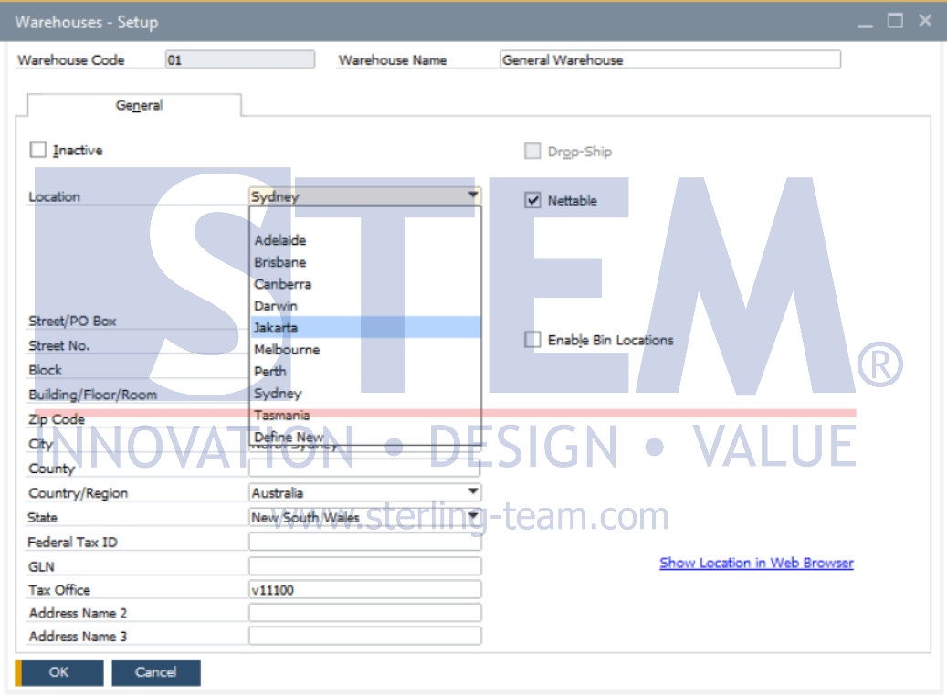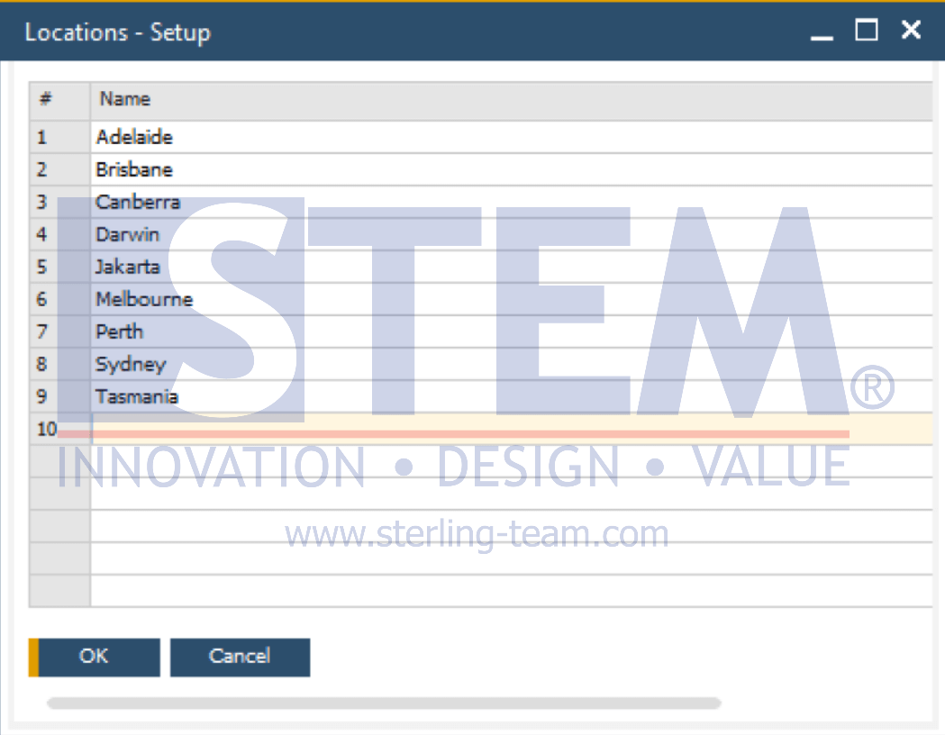 Pada SAP Business One, user dapat menentukan lokasi perusahaan atau lokasi cabang dan menghubungkannya dengan warehouse yang dimiliki. Pertama, daftarkan seluruh Lokasi yang dimiliki melalui menu Administration > Setup > Inventory > Locations.