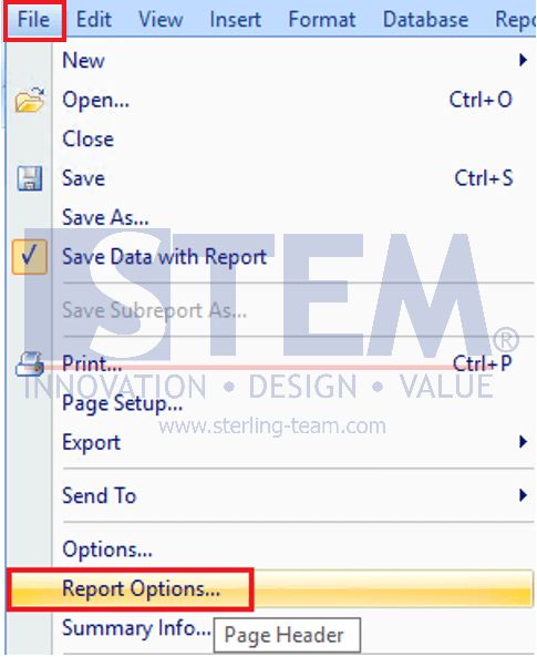 1. Buka report yang ingin dikunci, kemudian klik menu File > Report Options.