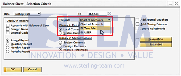 6. Buka laporan keuangan yang ingin ditampilkan, dalam contoh ini yaitu Balance Sheet Report. Pada jendela Balance Sheet – Selection Criteria, pilih template yang telah dibuat.
