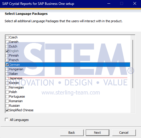 Bahasa tambahan pada SAP Crystal Reports tidak selalu terpasang secara otomatis. Proses instalasinya dapat dilakukan saat instalasi awal atau melalui Repair Installation, dengan memilih bahasa yang dibutuhkan pada jendela “Select Language Packages”.